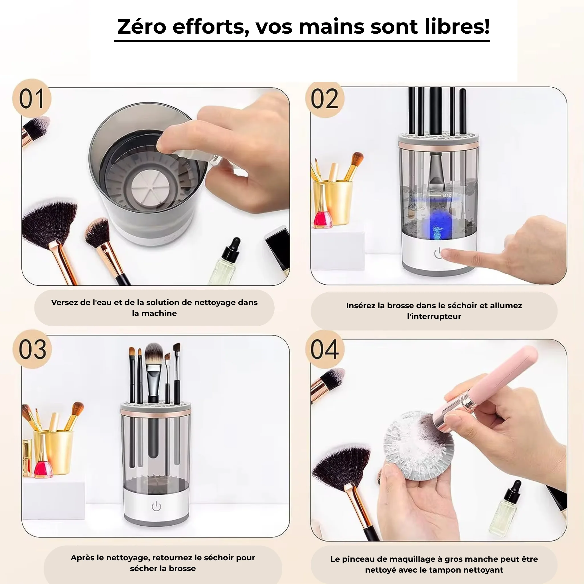 L'avantage ? Non seulement vos pinceaux sont parfaitement nettoyés en profondeur, mais ils sont aussi séchés en un clin d'œil ! Fini l'attente interminable, vos outils de maquillage sont prêts à être utilisés immédiatement pour un look impeccable, jour après jour.